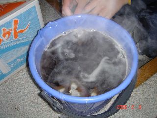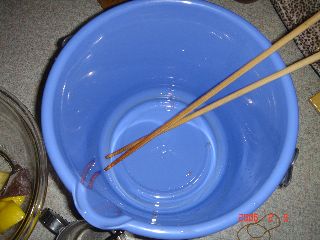 まずはお湯の入ったバケツにティーバックを入れますね。